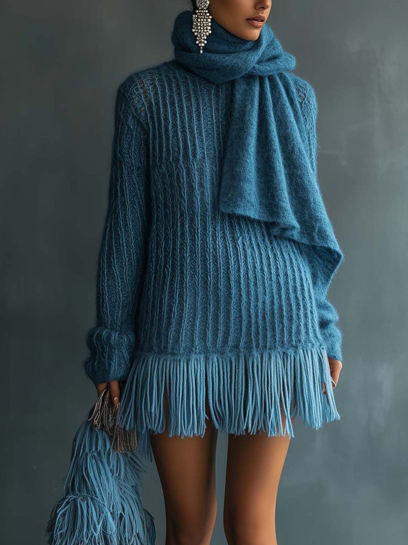 This blue knitted mini dress exudes bohemian charm with its tassel-trimmed hem and scarf integrated into the neckline. The scarf detail not only adds a design statement but also enhances warmth and comfort, making it both stylish and practical. The overall knitted texture lends a cozy sophistication, while the tassels bring movement and playful flair, balancing elegance with casual ease.