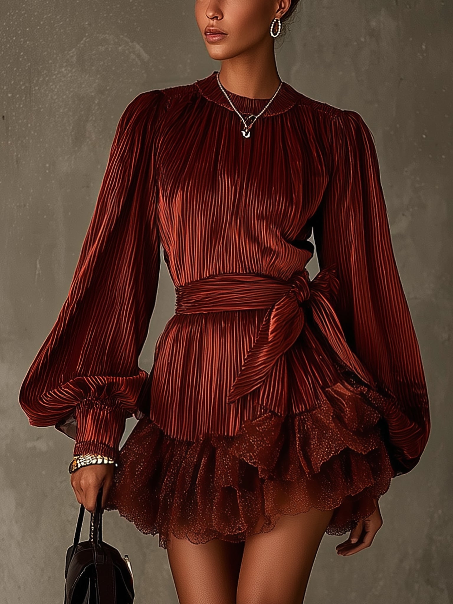 2. Design: Featuring long puffed sleeves, a high neckline, and a matching waist tie for an adjustable silhouette, the dress adds a dash of timeless elegance. The layered ruffle hem with subtle sparkles brings playful volume and a flirty, feminine twist.