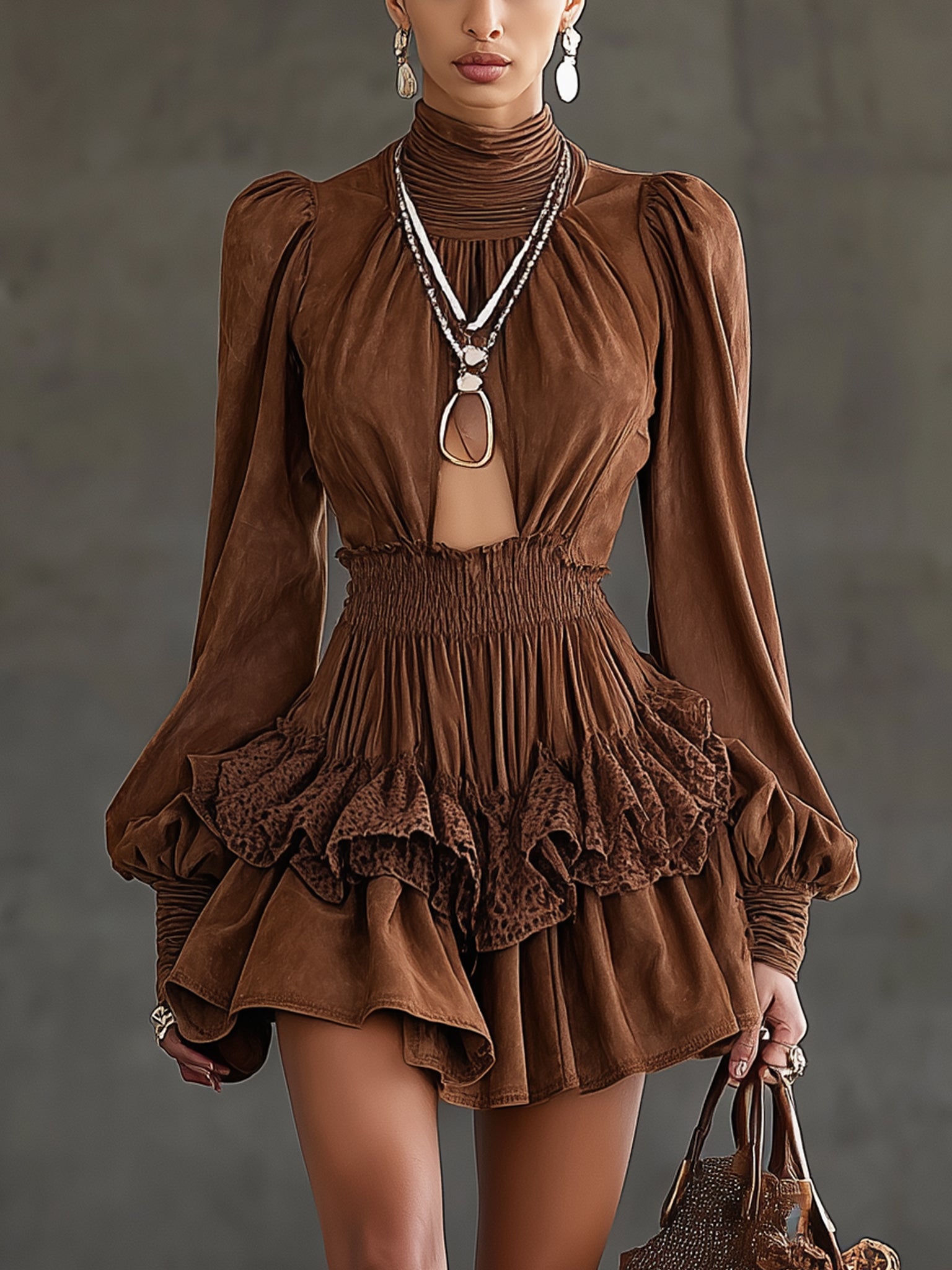 Chocolate Suede Ruffle Cutout Long Sleeve Mini Dress