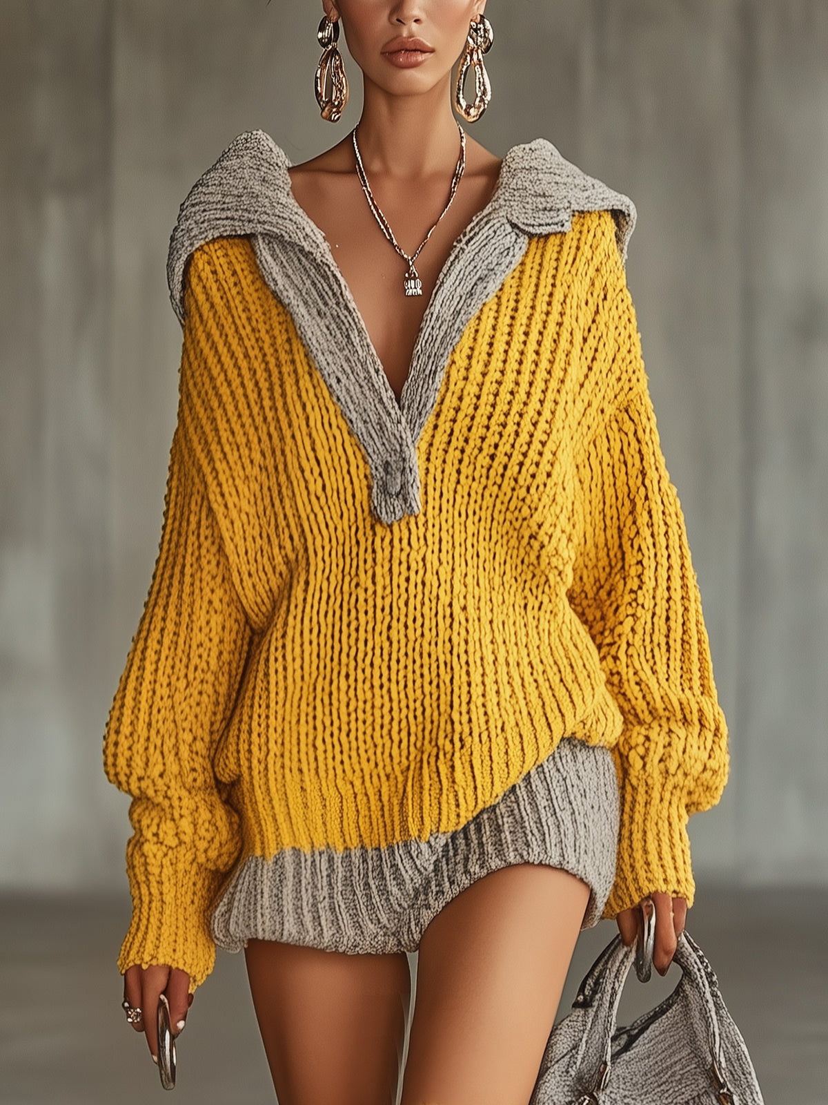 Stay warm and stylish with this eye-catching sweater dress. The vibrant yellow and soft gray create a beautiful contrast, adding depth to the chunky knit texture. Its oversized collar provides a unique focal point, merging comfort with a touch of contemporary style.