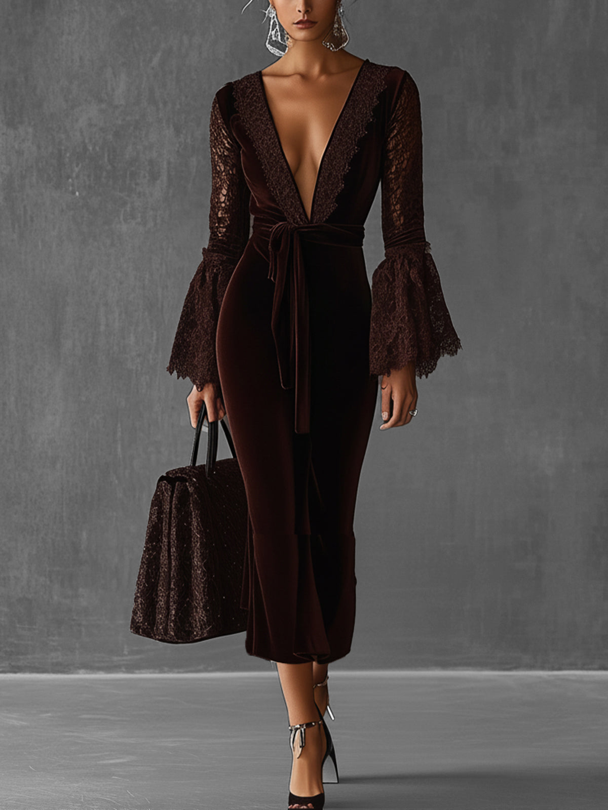This deep brown velvet dress captivates with its luxurious feel and bold design elements. The plunge neckline adds allure, while the lace bell sleeves introduce a touch of romance and elegance.