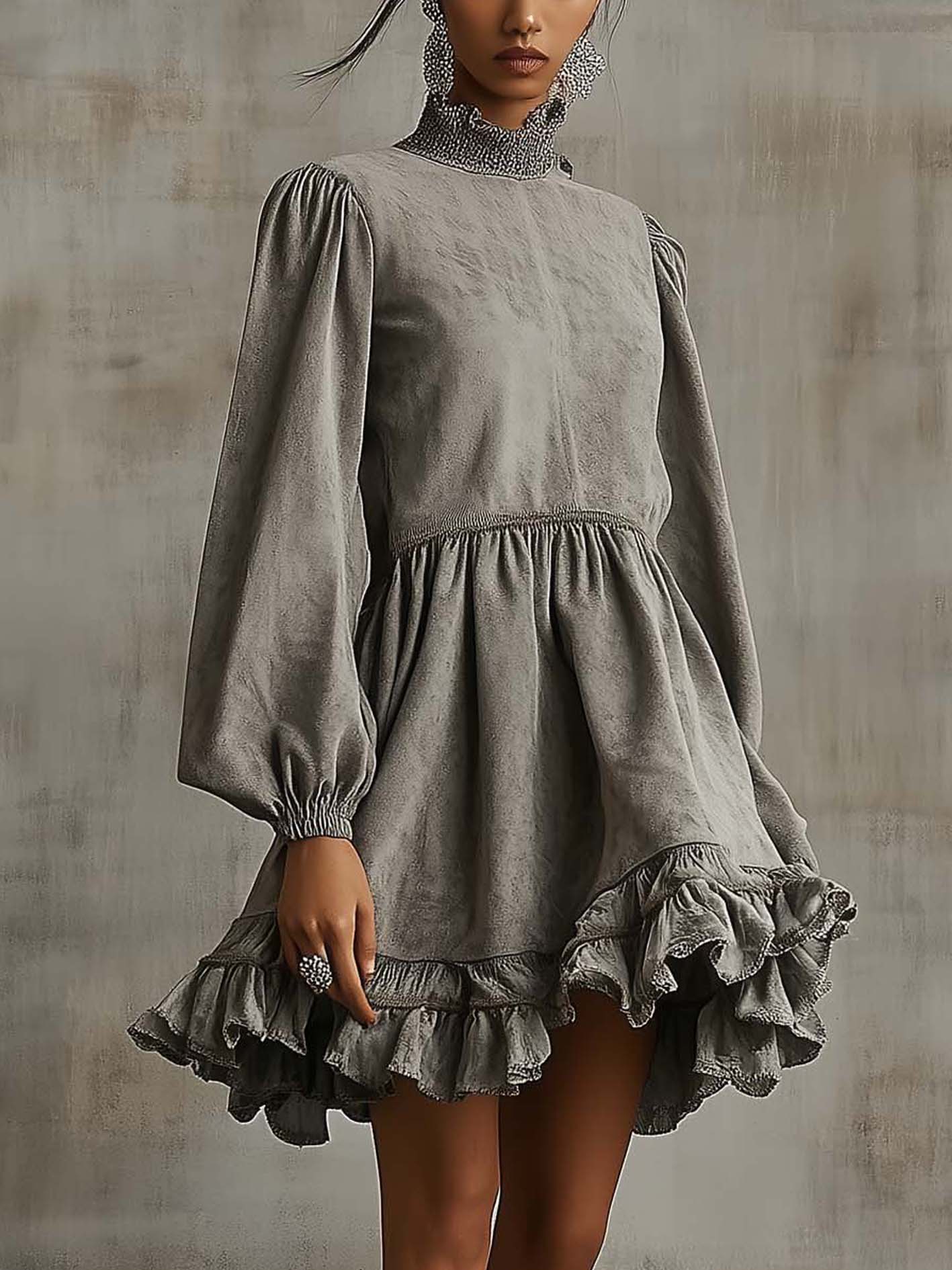 This gray faux suede mini dress exudes a mix of vintage charm and modern elegance. The high ruffled neckline and puffed sleeves lend a regal, romantic edge, while the ruffled hemline adds playful movement. The faux suede material keeps it contemporary, balancing softness with structure for a bold and stylish look that captures attention.