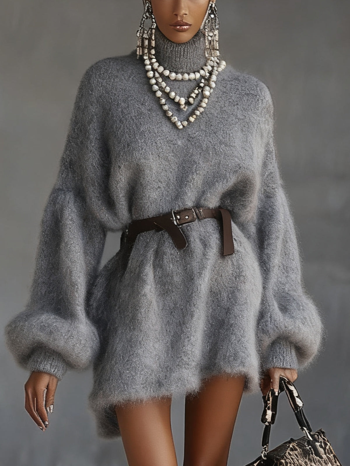 Gray Fuzzy Knit Turtleneck Dress With Balloon Sleeves And Belt