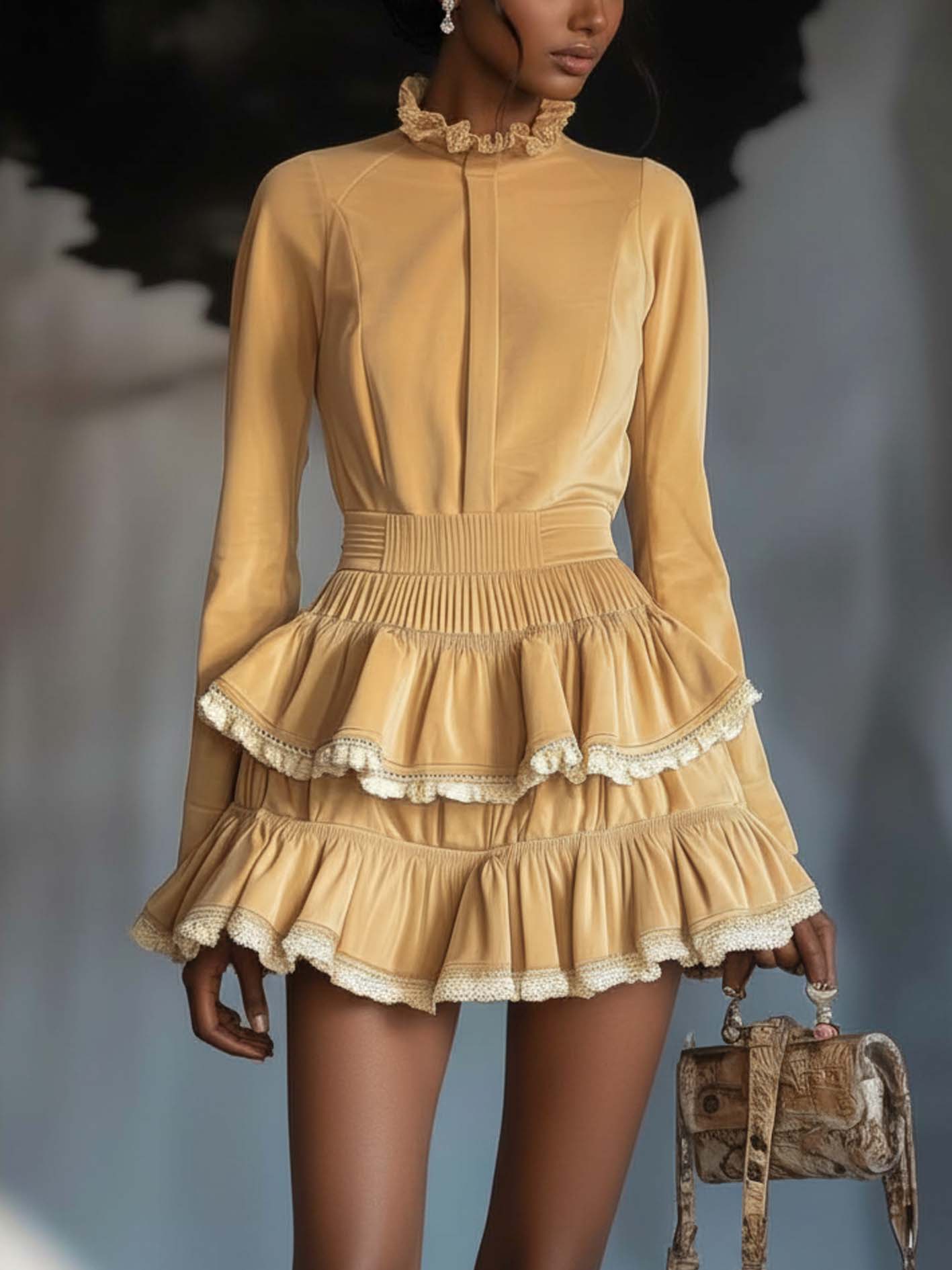 This light yellow velvet mini dress radiates charm and sophistication with its structured waist and tiered ruffles trimmed with lace. The velvet fabric gives it a luxurious richness, while the lace and frills soften the look with a romantic, playful quality. The high neckline with subtle ruffled edges brings a vintage-inspired refinement, elevating the dress into a chic, standout piece.