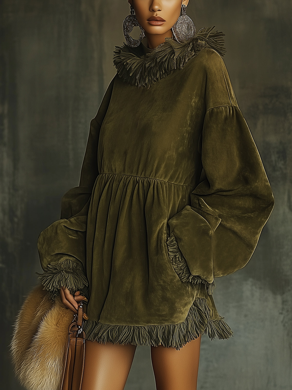 This olive fringe trim faux suede mini dress combines timeless elegance with playful textures. The velour fabric offers a rich, cozy feel, while the fringe detailing lends an artistic flair. Perfect for elevating your autumn wardrobe, this dress seamlessly blends comfort and sophistication.