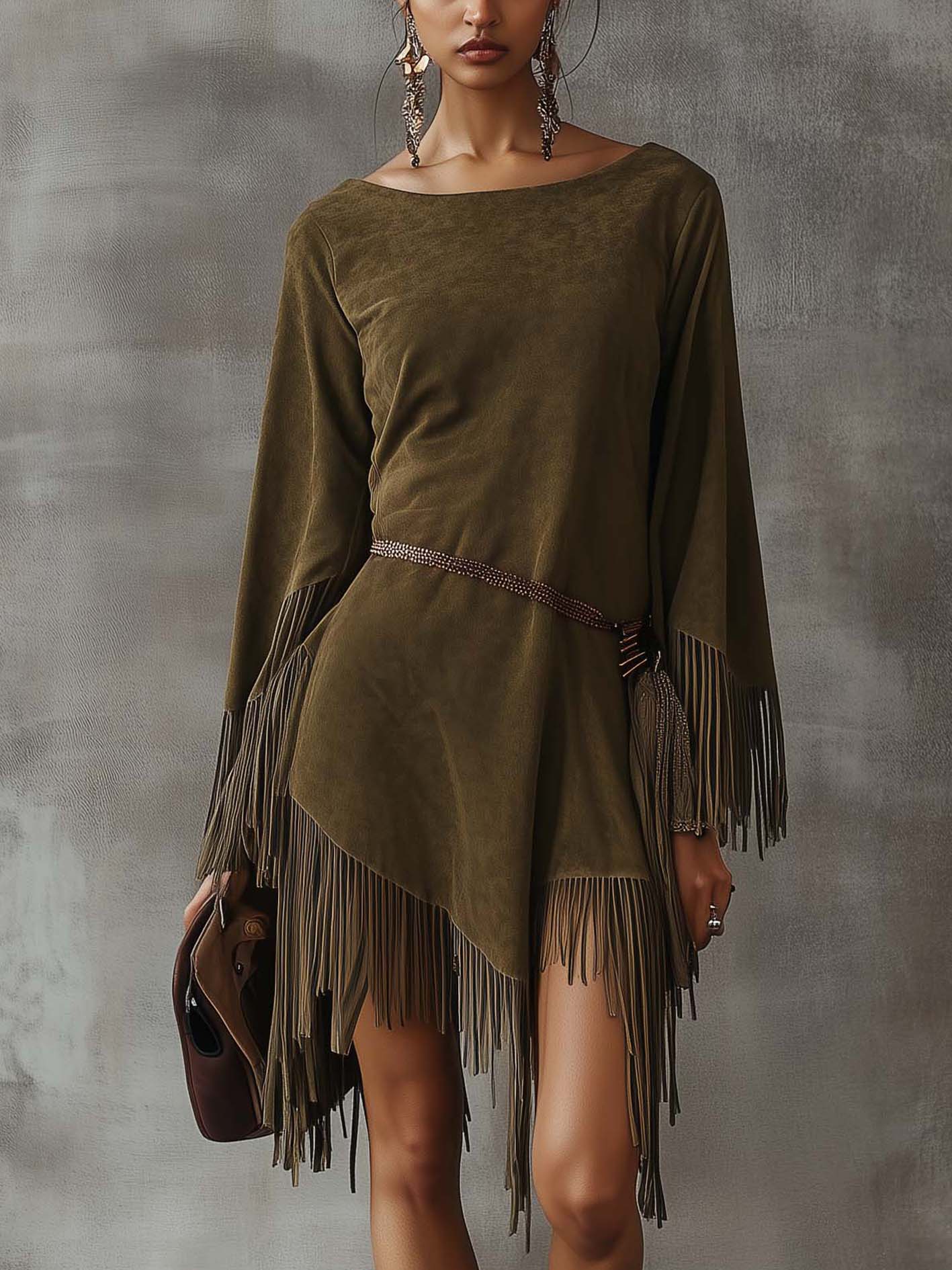 Olive Green Faux Suede Mini Dress With Irregular Tassels