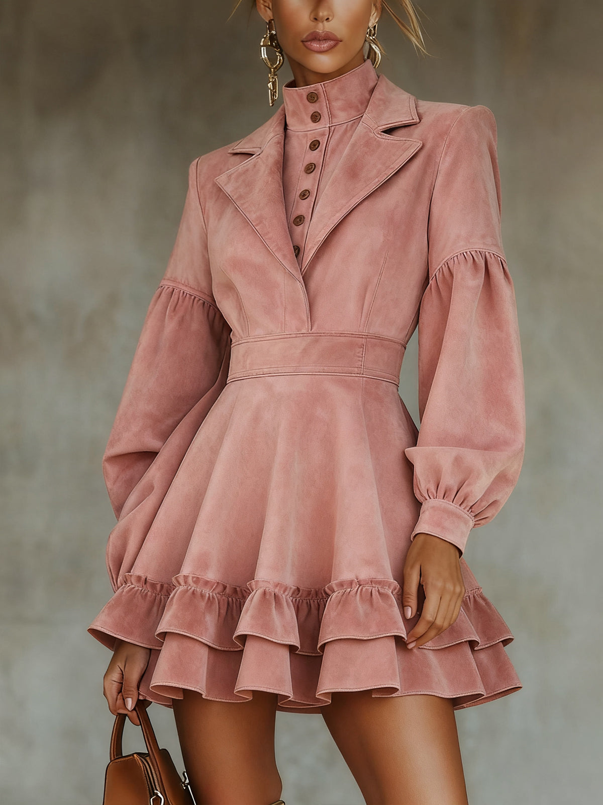 This blazer dress in blush pink combines sophistication with playful charm. The structured top and ruffled skirt create a balanced, eye-catching look. Pair with classic pumps and a chic handbag for a polished ensemble or add statement earrings and a bold lip for an evening of glamour.