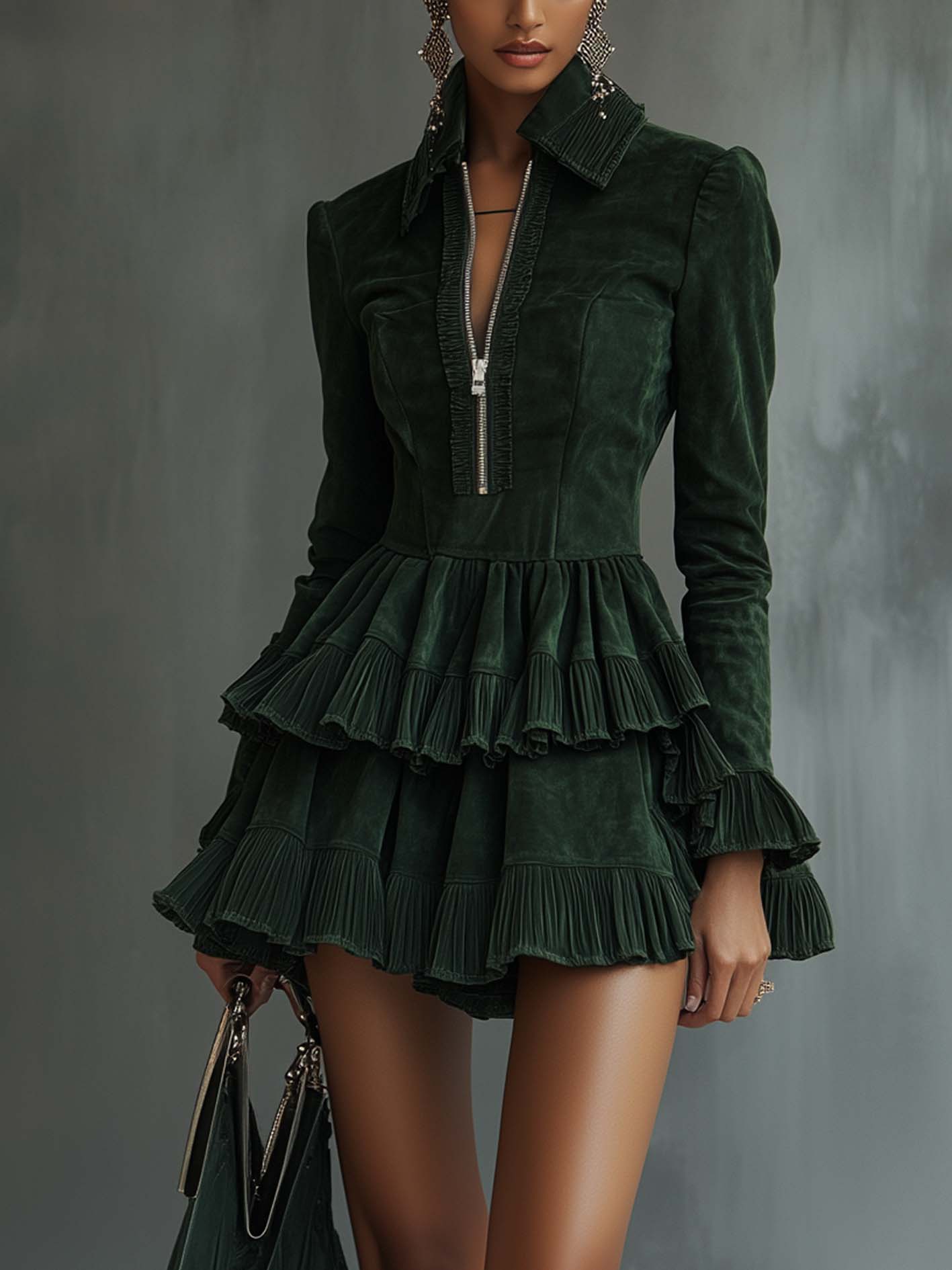 This retro green faux suede mini dress is a striking blend of vintage glamour and modern edge. The zipped front with its structured collar adds a touch of urban chic, while the layered ruffles create drama and sophistication. The deep green color enhances its retro allure, making it both bold and elegant at once. With its mini length and ruffle detailing, this dress ensures a powerful statement look.