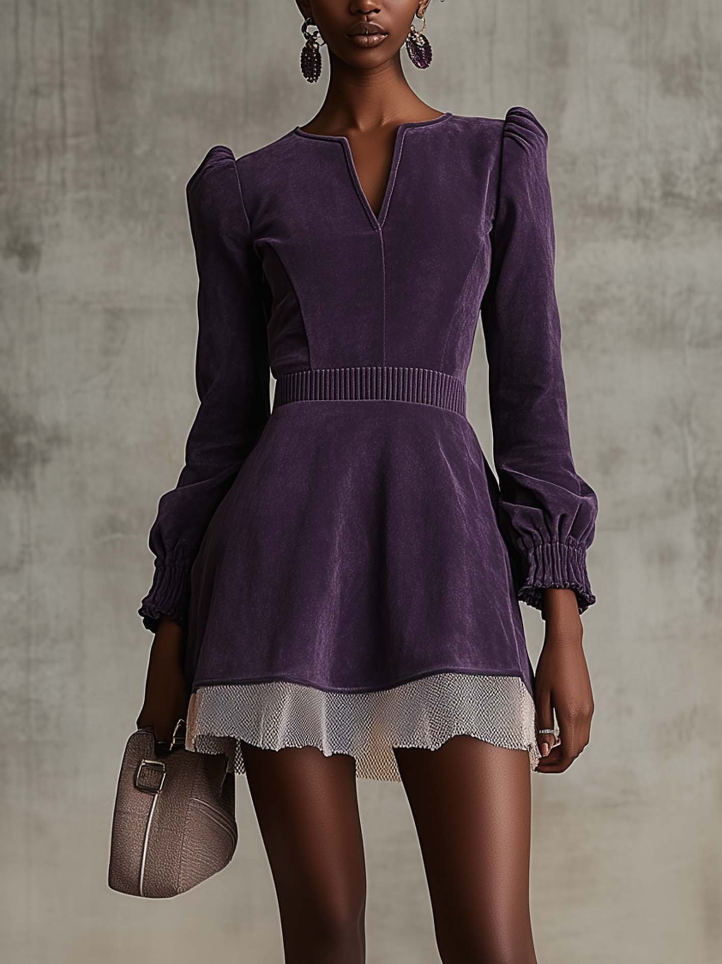 2. Design: A retro-inspired mini dress in deep purple, featuring puffed shoulders, long sleeves with gathered cuffs, and a subtle V-slit neckline.