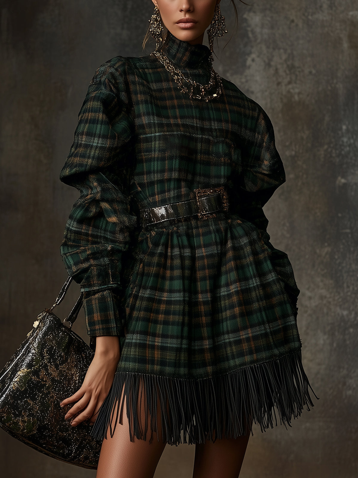 This tartan high-neck mini dress combines traditional patterns with modern style elements. The fringe hem and pleated details offer a unique, eye-catching appeal.