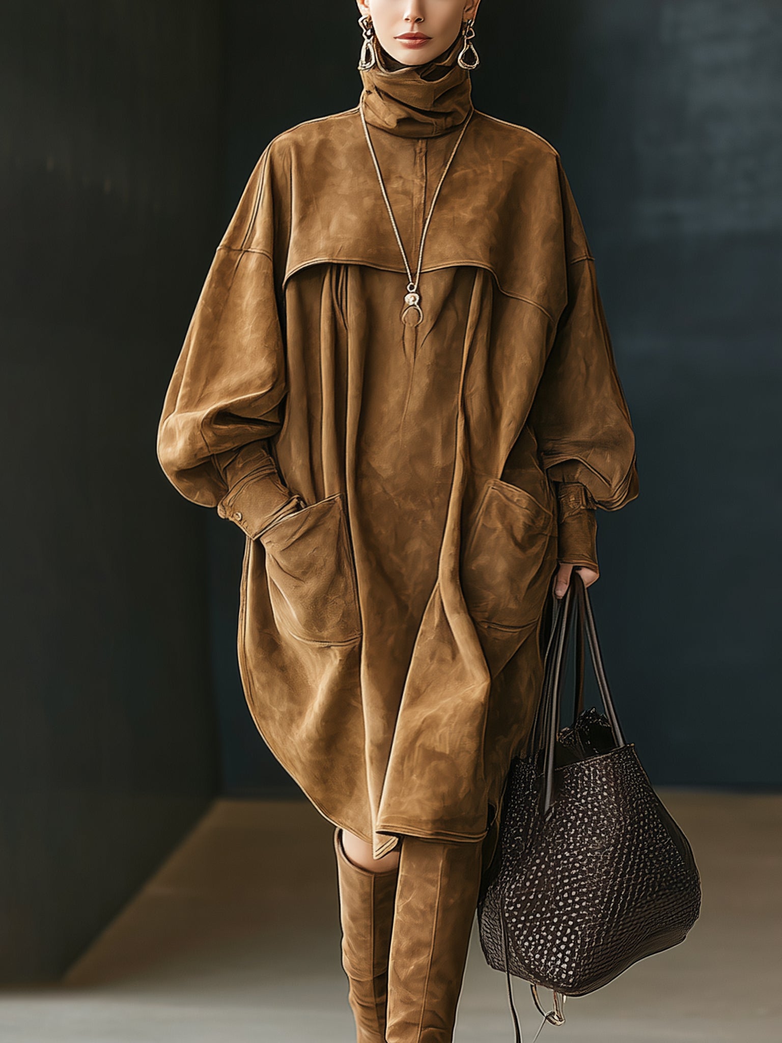 Vintage Brown Faux Suede Oversized Turtleneck Long Sleeve Midi Dress
