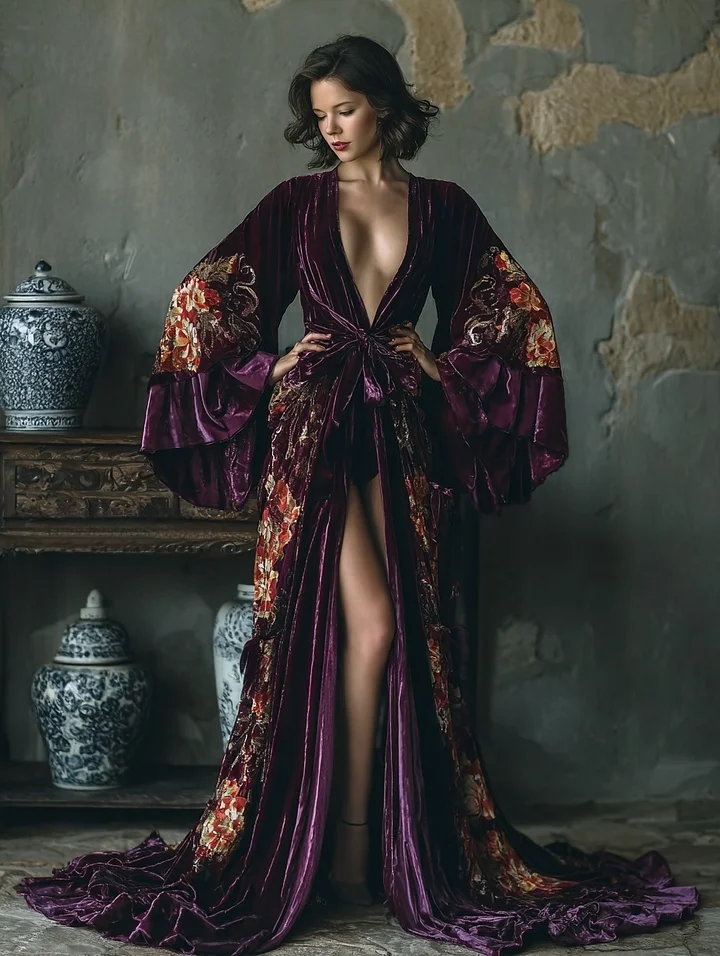 Embrace timeless elegance in our Velvet Couture Robe, crafted from sumptuous velvet that drapes like liquid luxury. This figure-flattering masterpiece features a belted waist that accentuates your silhouette while maintaining graceful comfort. Delicate floral embroidery cascades from the neckline, echoing vintage glamour with modern sophistication. The floor-length design flows with regal grandeur, perfect for special occasions or luxurious lounging. Includes a matching self-fabric belt that defines the waist beautifully. Experience aristocratic comfort and refined style in this heirloom-quality piece designed for discerning women who appreciate life's finest pleasures.