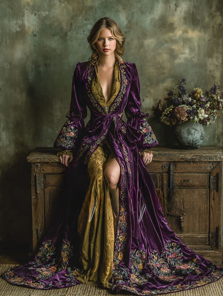 Embrace timeless elegance in our Velvet Couture Robe, crafted from sumptuous velvet that drapes like liquid luxury. This figure-flattering masterpiece features a belted waist that accentuates your silhouette while maintaining graceful comfort. Delicate floral embroidery cascades from the neckline, echoing vintage glamour with modern sophistication. The floor-length design flows with regal grandeur, perfect for special occasions or luxurious lounging. Includes a matching self-fabric belt that defines the waist beautifully. Experience aristocratic comfort and refined style in this heirloom-quality piece designed for discerning women who appreciate life's finest pleasures.